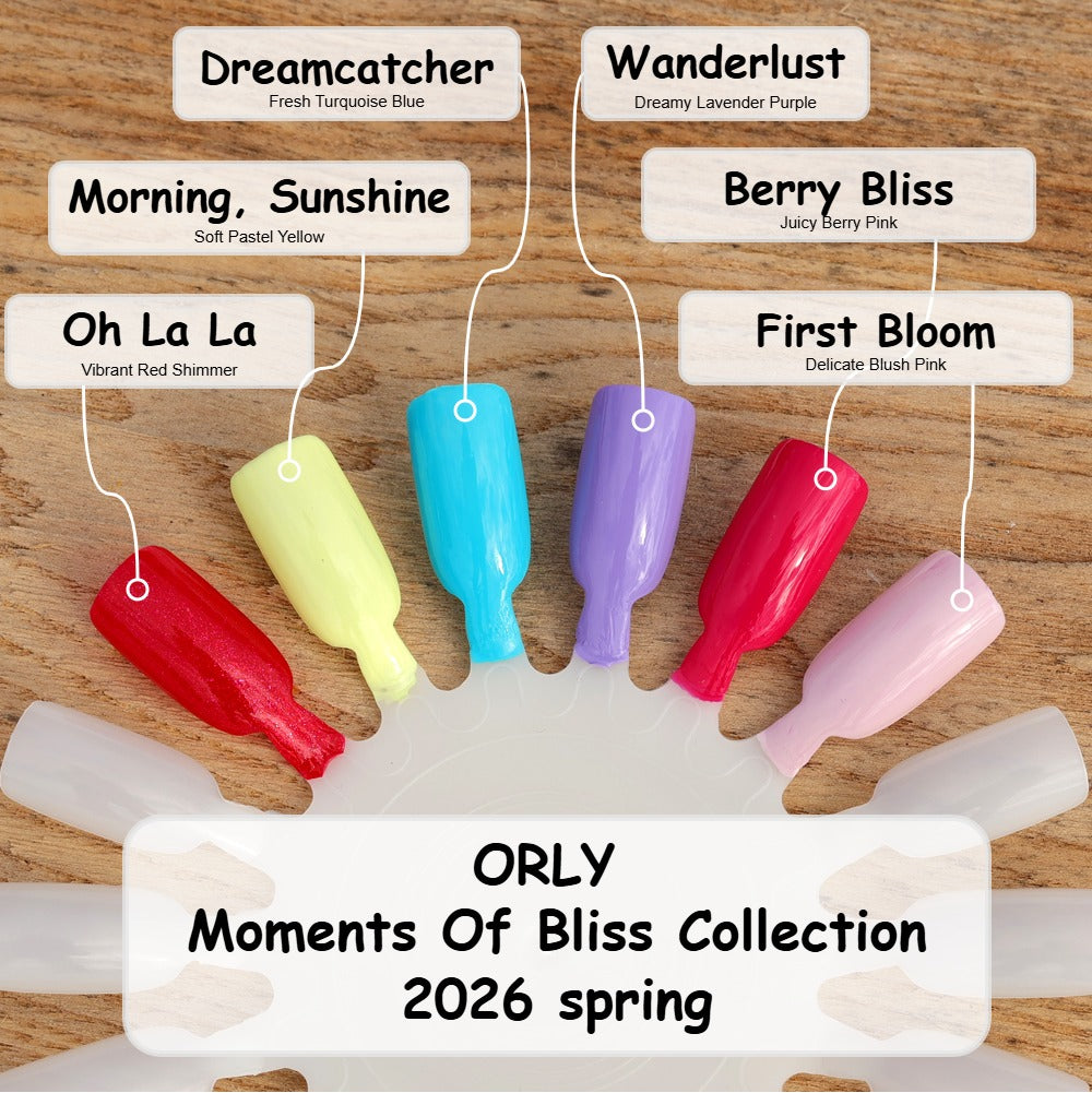 Moments of Bliss est la collection de couleurs printemps 2026 signée ORLY, inspirée par la douceur, l’optimisme et le renouveau de la saison printanière. Cette collection incarne les grandes tendances couleurs ongles printemps 2026, où des teintes lumineuses et joyeuses se mêlent à des pastels doux et apaisants.