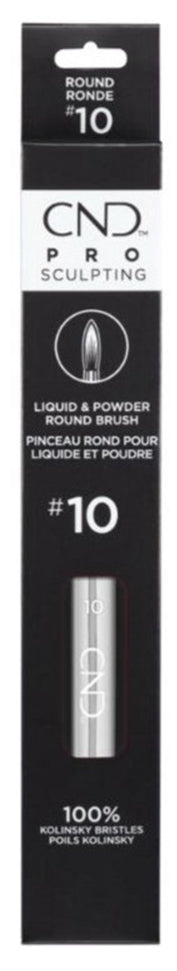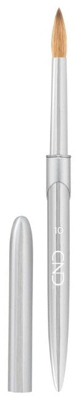 cnd pro sculpting liquid & powder round brush #10 is a high-quality brush made for precise acrylic nail sculpting and artistic detailing. featuring 100% real kolinsky hair, it allows for excellent bead control and smooth application. the brush has a lightweight, solvent-resistant aluminum handle and comes with a protective cap for hygienic storage and portability.